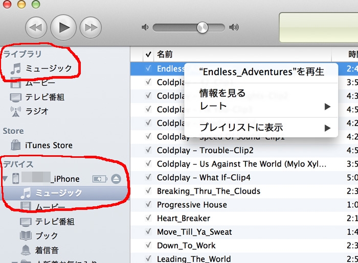 デバイス」-「(iPhoneの名前)」-「ミュージック」