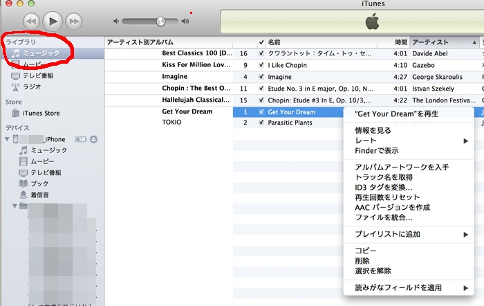 デバイス」-「(iPhoneの名前)」-「ミュージック」