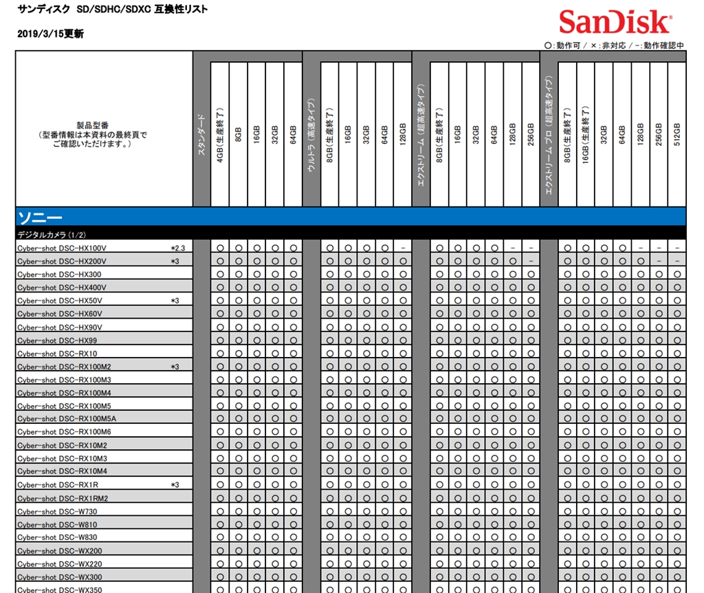 『2019年3月15日現在のWX200含むSDカード互換性情報』SONY サイバーショット DSC-WX200 sumi_hobbyさんのクチコミ掲示板画像1/1