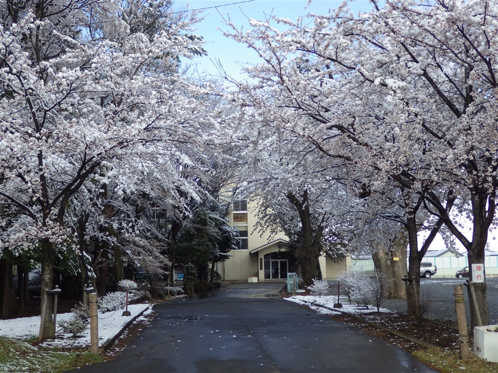 小学校の桜に雪が