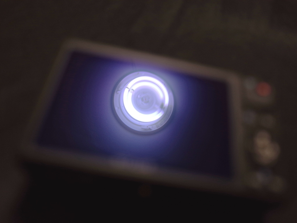 背面液晶に映った蛍光灯。カバーを外して蛍光管を丸出しにしています