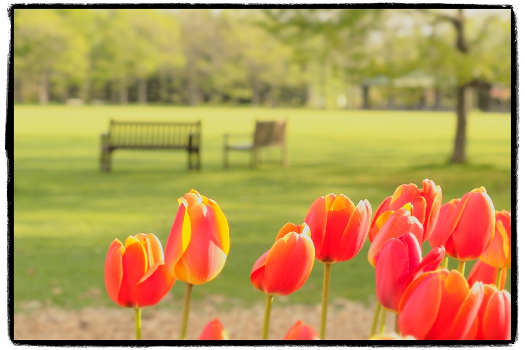 チューリップとベンチ