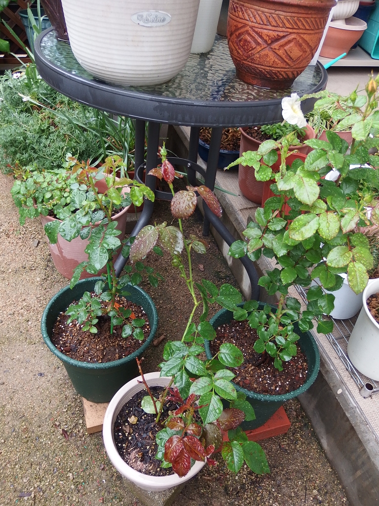 左から(レオナルドダビンチ、ブルーバユーの折れ枝の挿し木、ベビーロマンティカ)