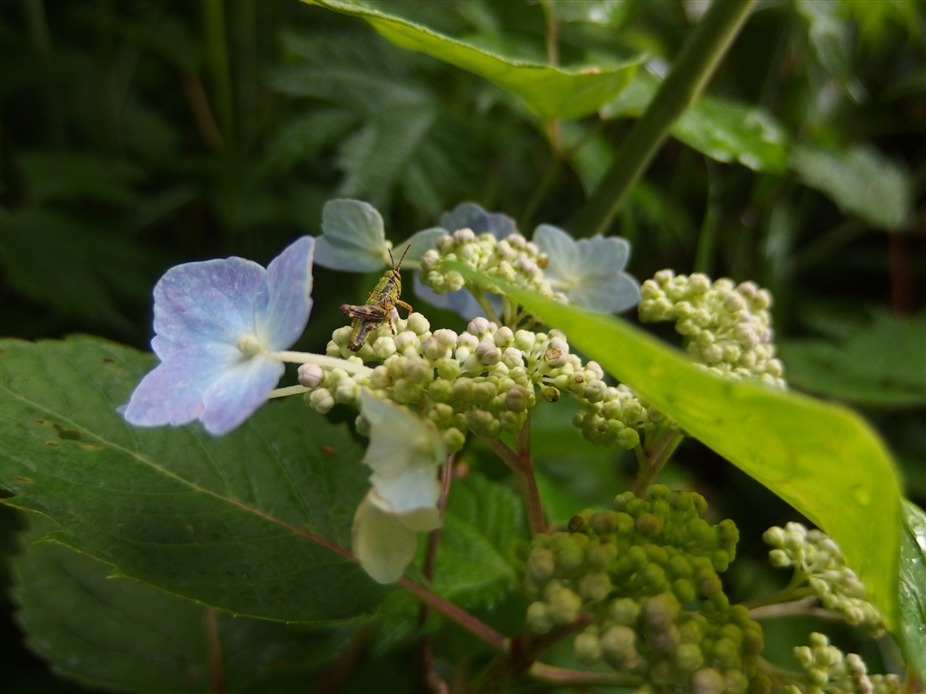 ヤマアジサイとミヤマフキバッタの子供