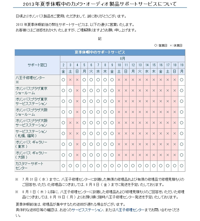 オリンパス2013年夏季休暇中のサポート体制