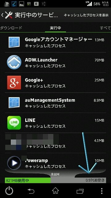 アプリキャッシュ(設定→アプリ→実行中→矢印をタップ)