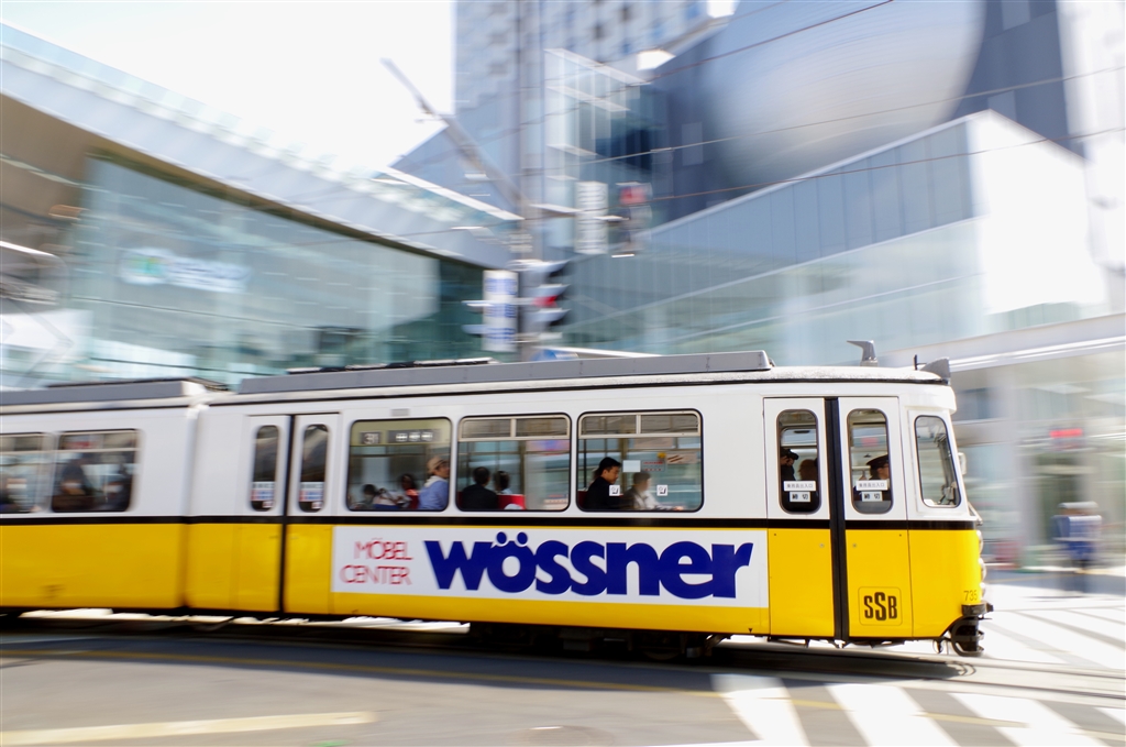 再開発ビル前のスクランブルを横断する新線区間を行く。謎の球体はプラネタリウム