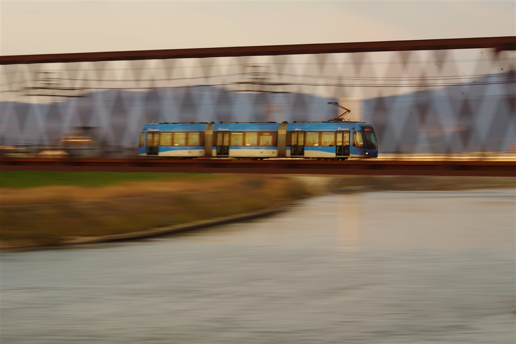 夕日を浴びてえちぜん鉄道九頭竜川橋梁を渡る福井鉄道F1000形