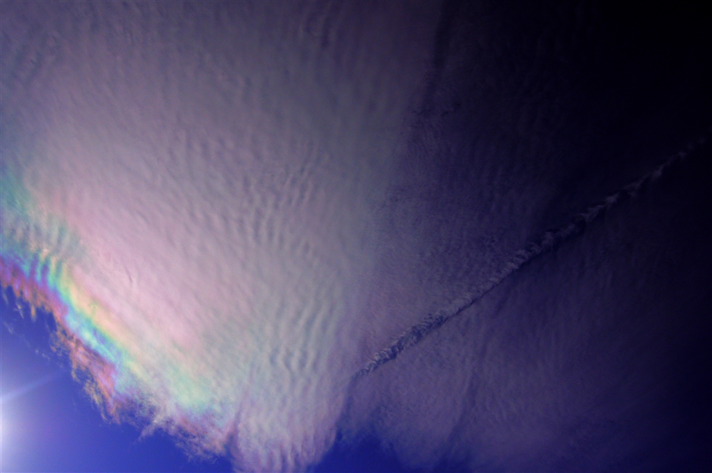 高層雲に現れた彩雲と消滅飛行機雲