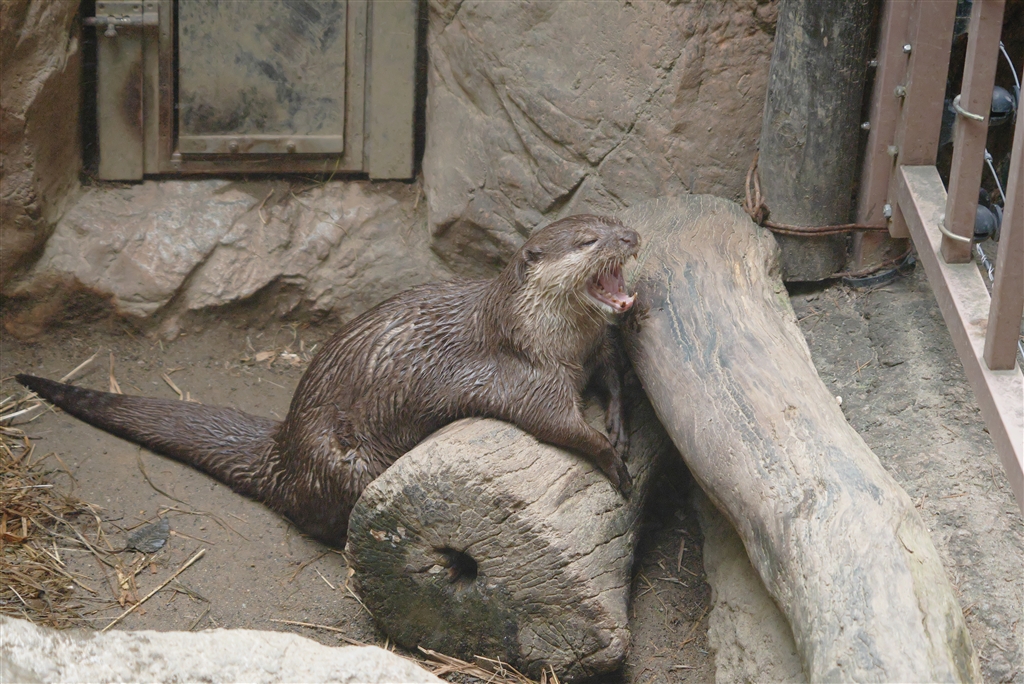 ガラス越しにカワウソのあくび。。PZ45-175mmにゴムフードで