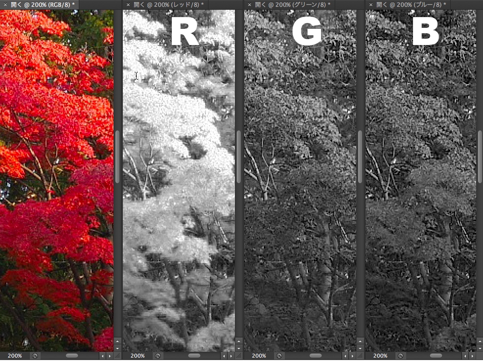 日が射した部分は、レッドよりもグリーンとブルーで解像しています。