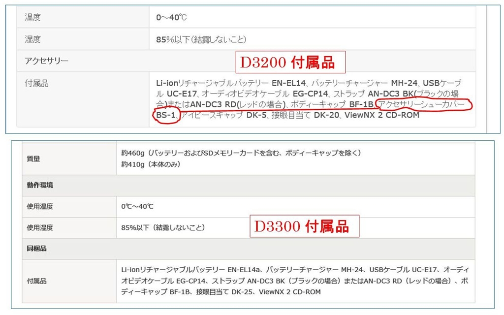 『上側 D3200用付属品一覧 下側 D3300付属品一覧』ニコン D3300 18-55 VRII レンズキット F5よりF4そしてニコマELさんのクチコミ掲示板画像1/1
