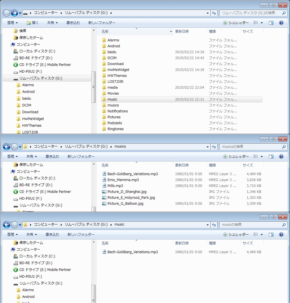 『(1)フォルダ状況。「musics」フォルダ内の3曲は初期インストールされていたもの。』HUAWEI Ascend G6 SIMフリー nanaco112さんのクチコミ掲示板画像1/2