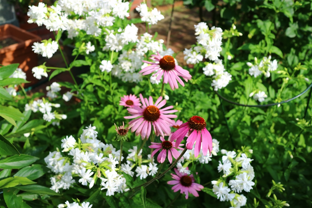 暑さに強いエキナセアとソープワートが賑やかしてくれてます。