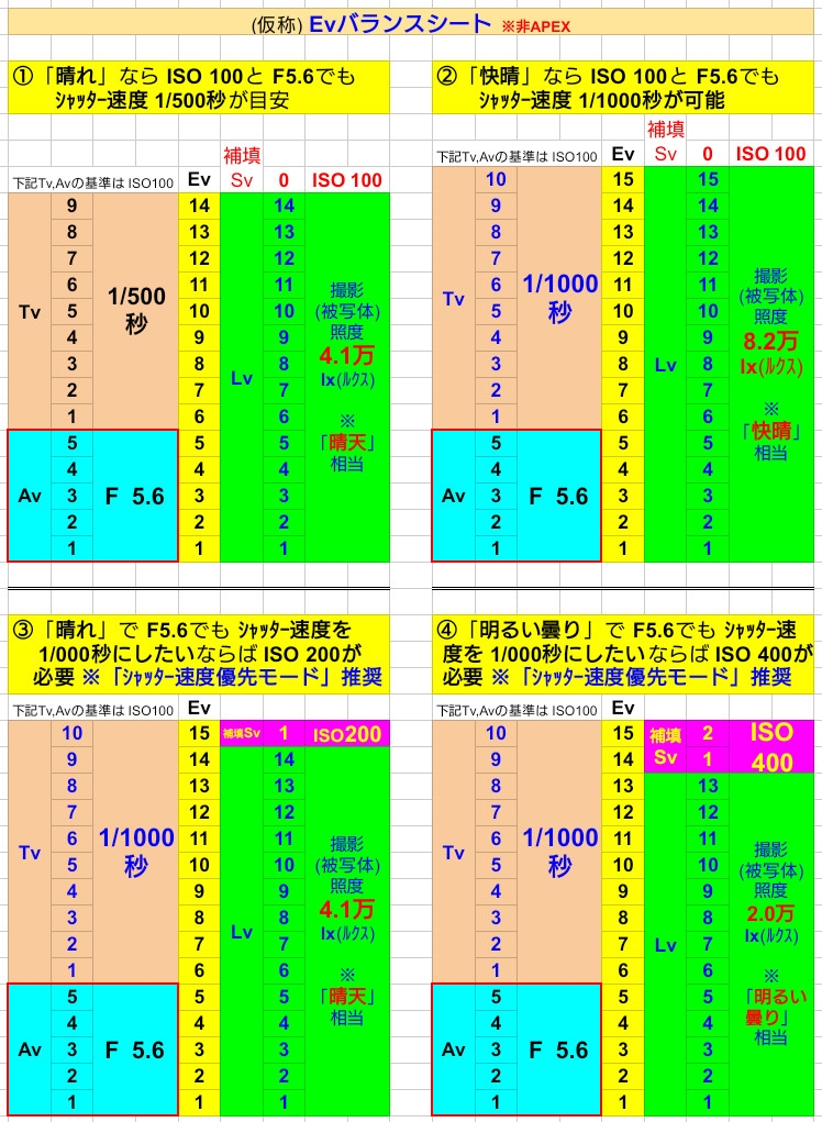 日中屋外で「1/500秒」※F5.6例 Evバランスシート