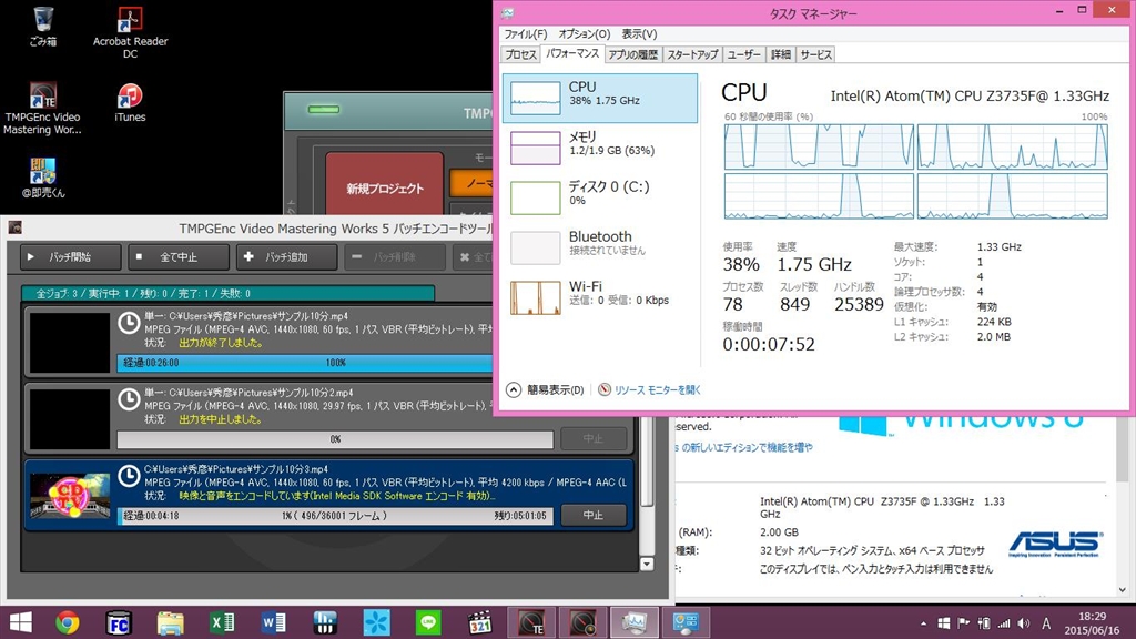 Intel Media SDK Softwareエンコード、45%使用率前後で推移・終了まで5時間予想