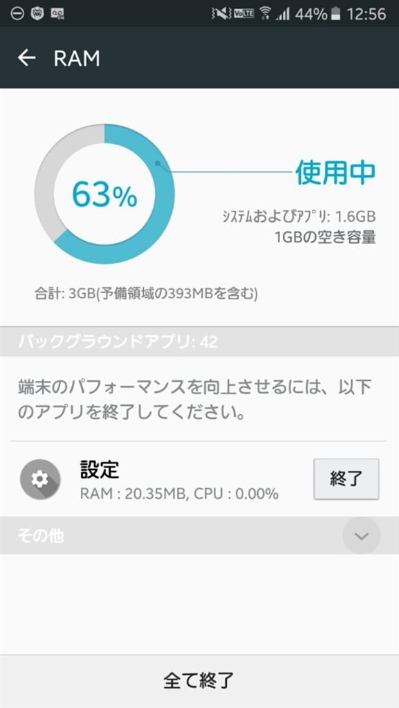『タスク(アプリ履歴)のみ残した状態でのRAM』サムスン Galaxy S6 SC-05G docomo なか〜た♪さんのクチコミ掲示板画像2/2