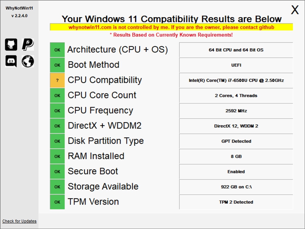『WhyNotWin11実行結果』Dell XPS 13 プラチナ・QHD+タッチパネル Core i7 6500U・Windows 10搭載モデル あまの55さんのクチコミ掲示板画像1/1