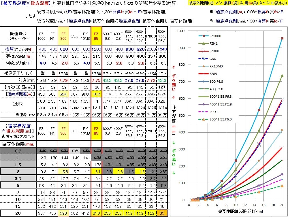 被写体後方のピント深さ例※単位【mm】※近距離20m以下