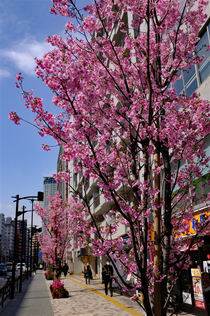歩道の河津桜は満開です