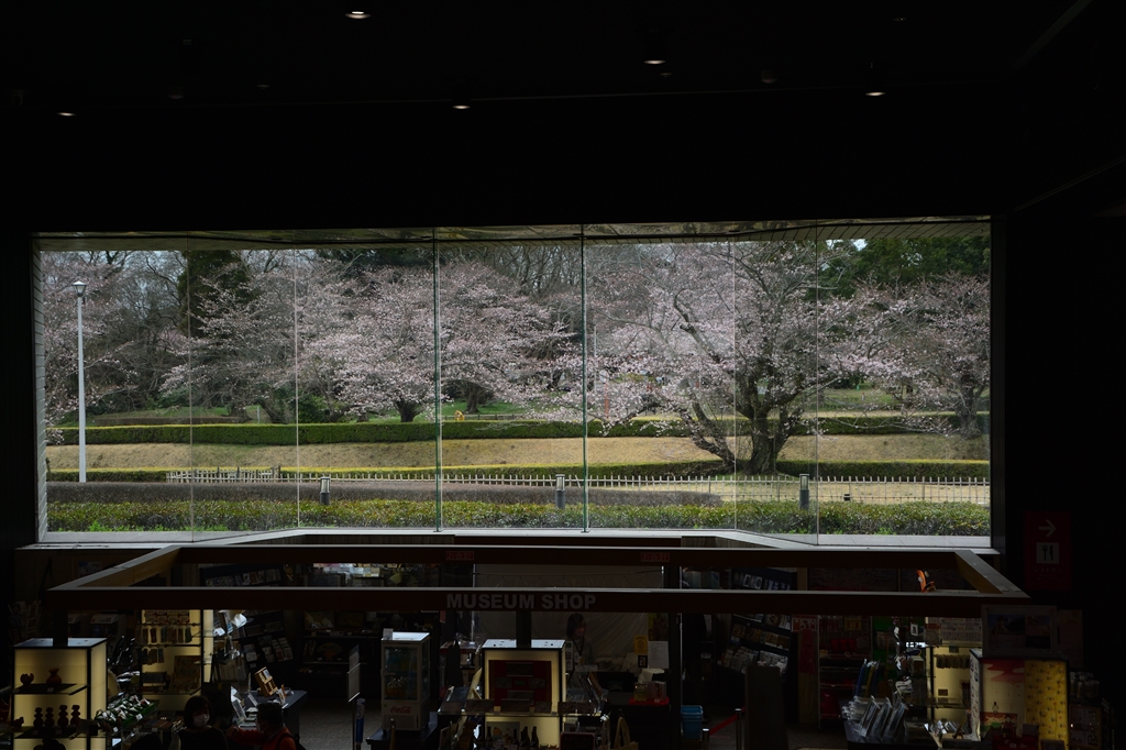 歴史博物館内の大きな窓ガラスから城内の桜が