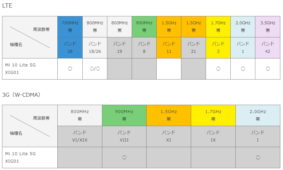 『シムロック解除後に利用出来るバンド一覧』Xiaomi Mi 10 Lite 5G XIG01 au Taro1969さんのクチコミ掲示板画像1/2