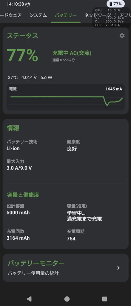 別機種でのDevCheckでの供給モード参考画像。充電器がPPS非対応で9V3Aを使用。