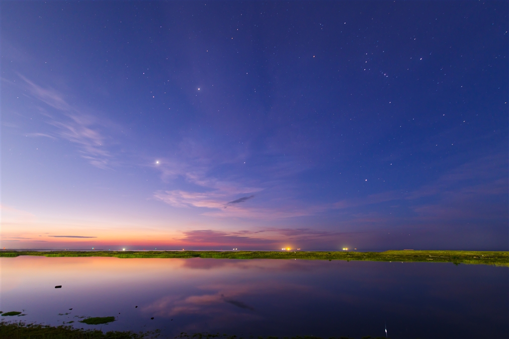 干潟の夜明け 木星を追って金星が昇ります オリオン座が主役でした