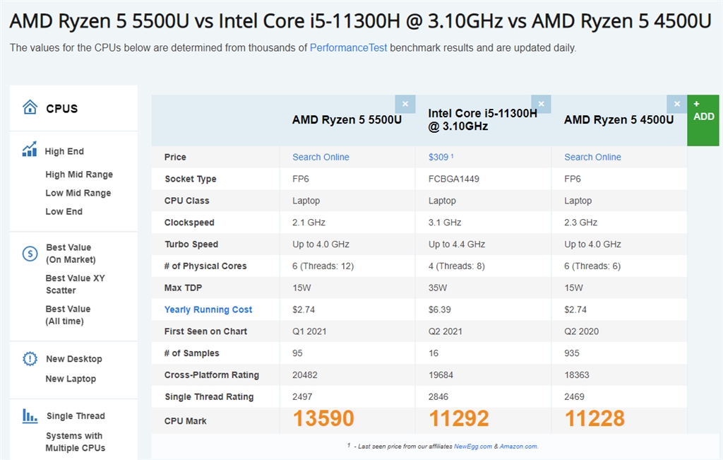『CPU スコア(CPU Mark)の比較』Dell Inspiron 15 AMD プレミアム Ryzen 5 5500U・8GBメモリ・256GB SSD・Wi-Fi6搭載モデル CwGさんのクチコミ掲示板画像1/1