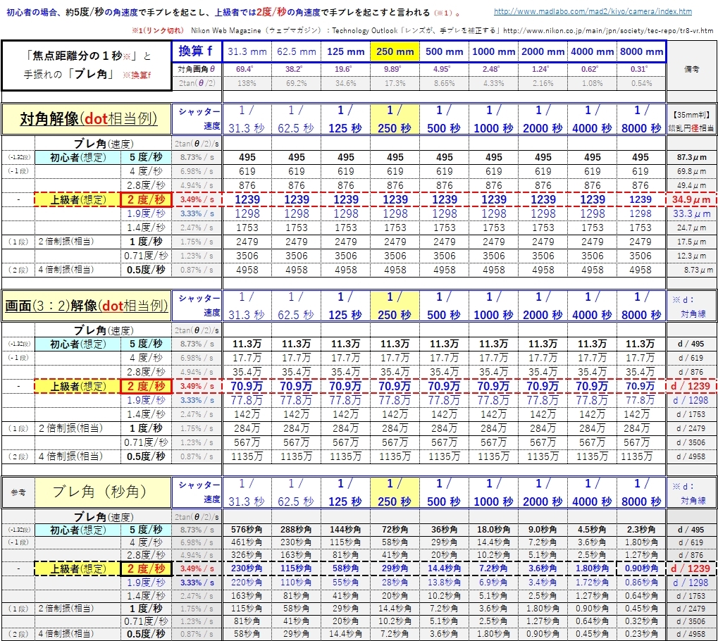 【手ブレ】想定ブレ角とシャッター速度など