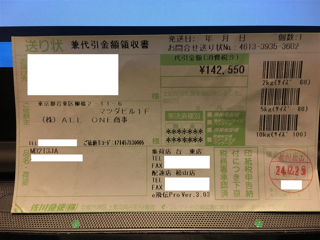 代引金額領収