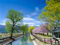 奈良県桜井市の長谷寺、桜咲く頃の風景