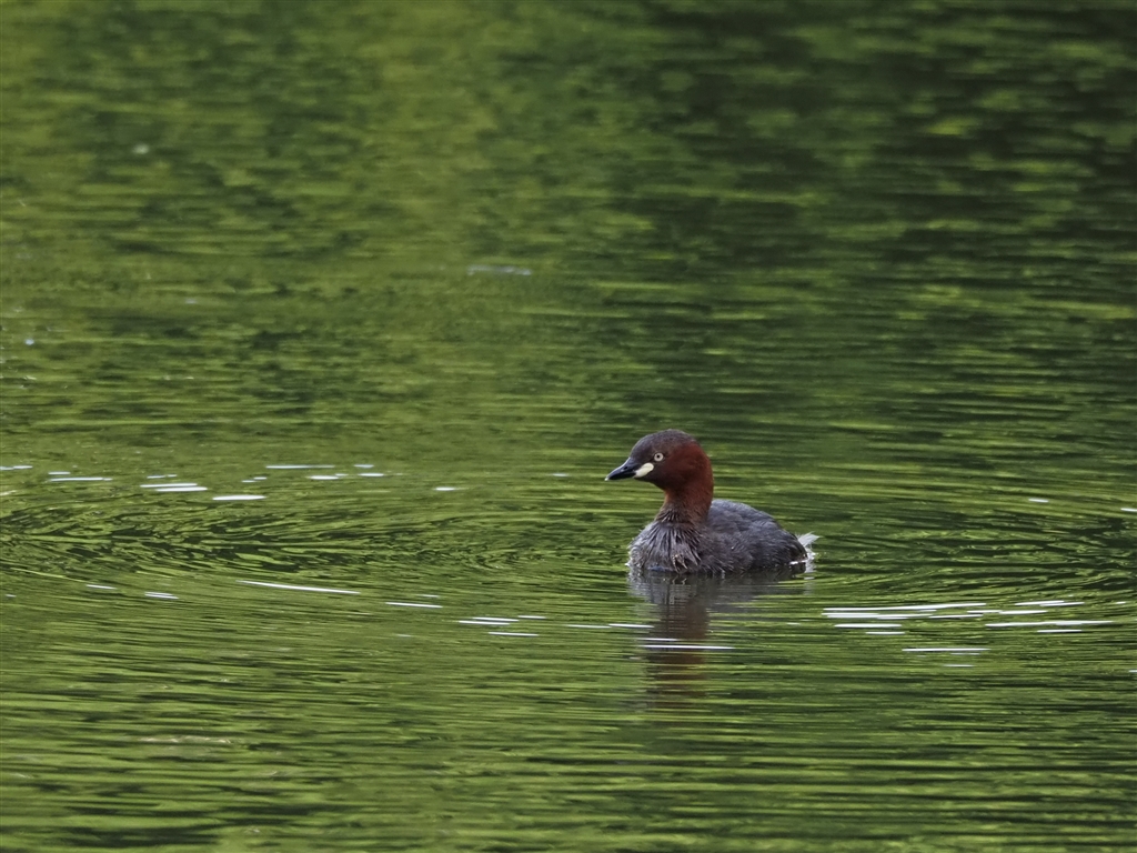 高層マンションの影の中に浮いているカイツブリ