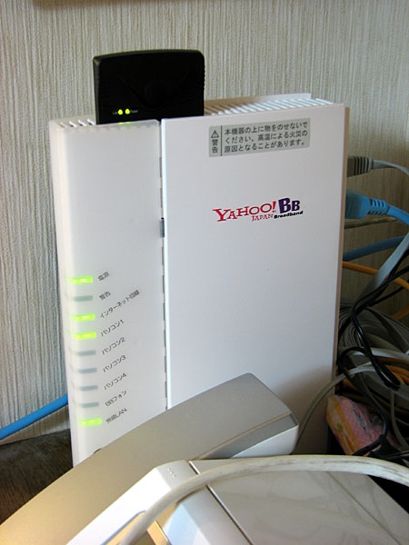 最大時6台を接続しているルーター。上部の黒い機器が、カード型無線LANです。