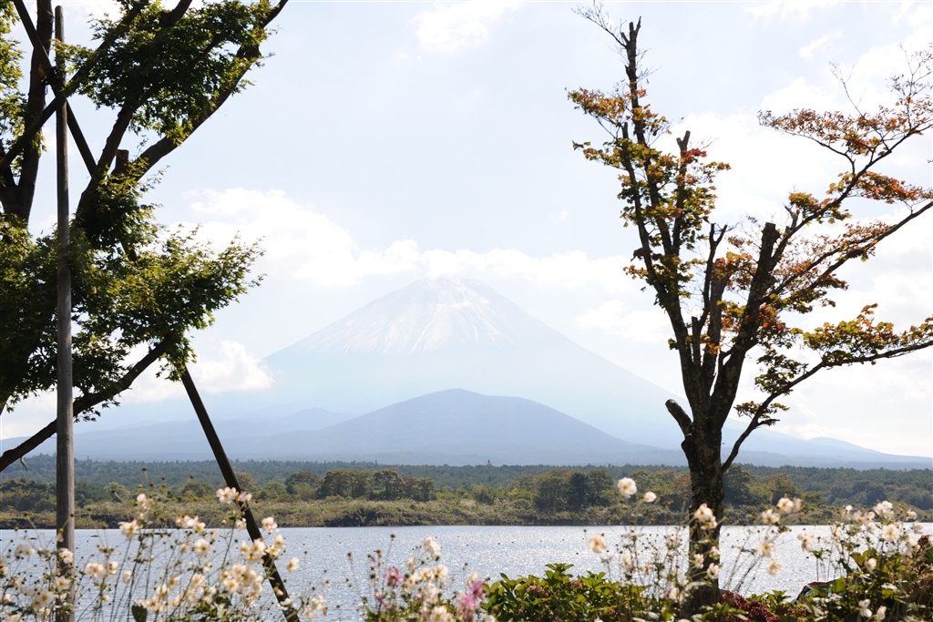 精進湖の湖畔で富士に焦点
