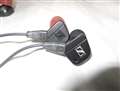 >それと、写真ではイヤホンのアップですが、赤いイヤーピースが付いているイヤホンがヨドバシにて購入したイヤホンで、ゼンハイザーのマークがメッキですが、今回落札したイヤホンはマークがヘアラインになっています。 写真では少し解りにくいですが、ちょっと見ると解ります。