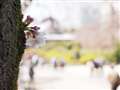 東京タワーと神社の屋根のバック 桜の周りの空気感が伝わってきます。