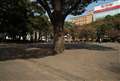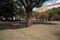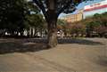 ピントは、奥にある遊具の屋根に合わせています。
