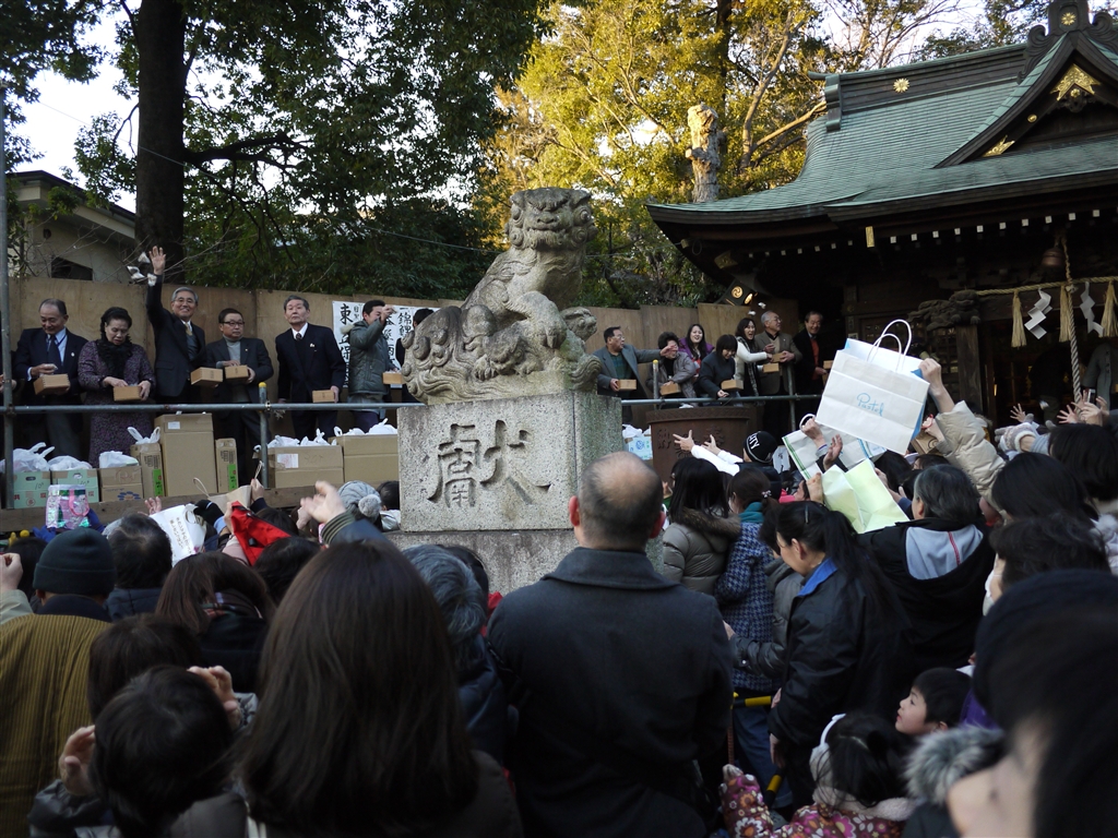 近所の神社で豆まき。豆の袋に当たりが出ると景品。