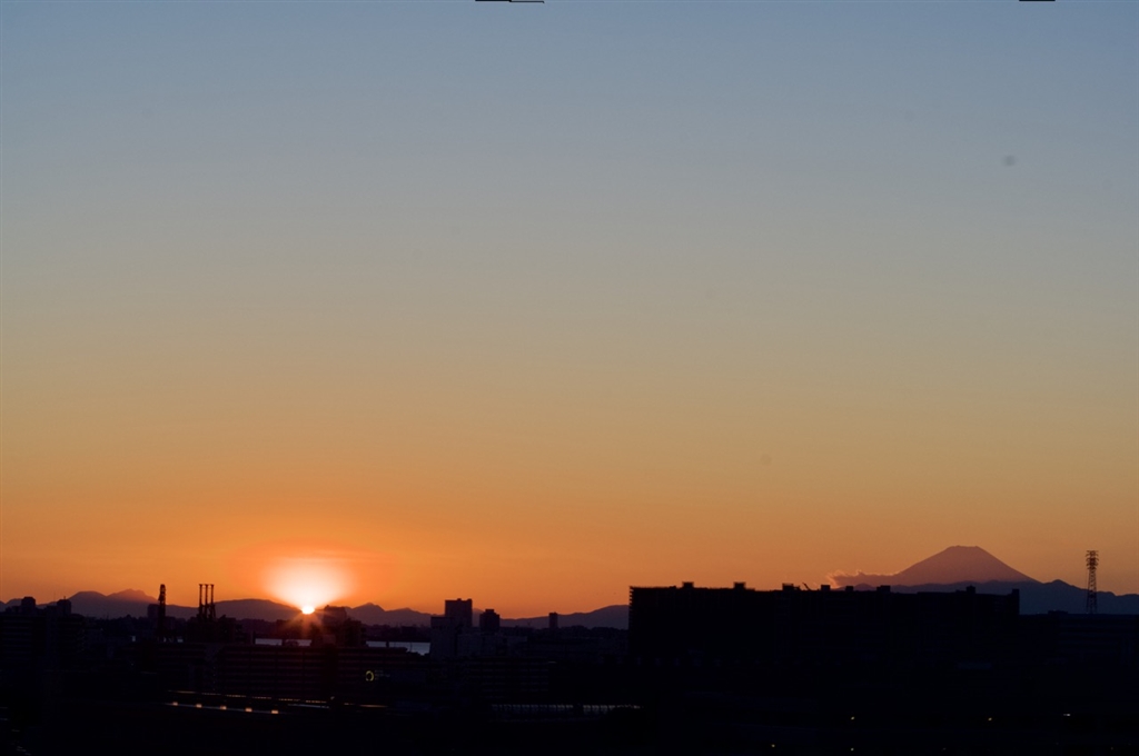 沈む夕陽と富士山。