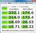 これを[RAID 0]にするとSeqリード[232.1MB/s]・Seqライト[174.6MB/s]と、リードは低下・ライトはそれほど変化無しの状態です。