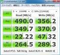 >P55チップに繋いでいる「X25-E Extreme」2台のRAID 0 ではリード[490MB/s]・ライト[356MB/s]も出ているのに