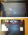 ↓この動画のパソコンは、同じ型ではありませんが、かなり近い型と思われます。この動画によると、キーボード上部に三か所ネジ穴があります。この動画を参考に、パソコンの裏のネジを三か所(添付画像の赤四角の部分)外しました。