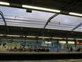 太陽光の空と、蛍光灯下の駅ホーム。