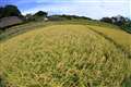 レンズの傾きで変わります。少し上を向いて撮れば空が大きく入りますし、下を向いて撮れば地面(この場合は稲)が大きく入ります。上手く水平を出せば、普通の超広角に近い感じになります。