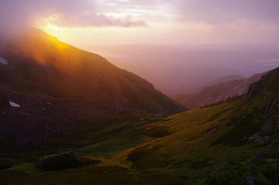 霞が朝日に赤く染まっています。