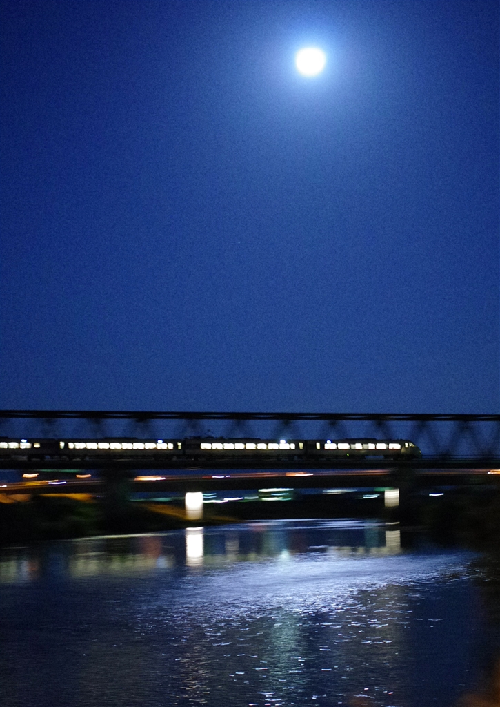 月光に輝く足羽川を渡る