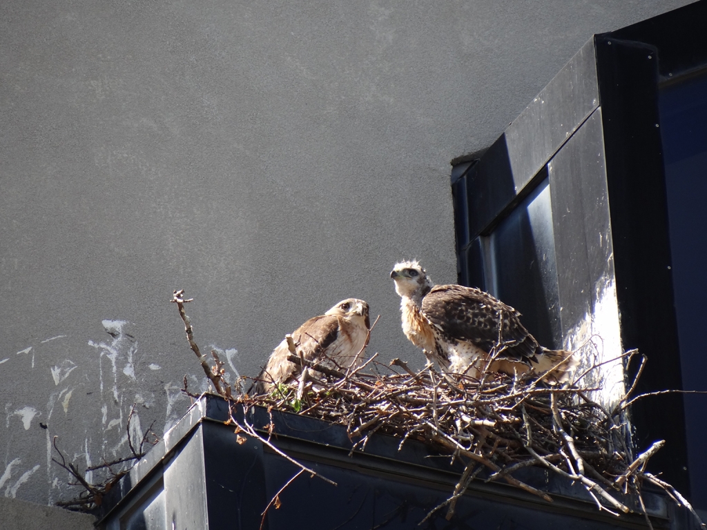 ビルに作られた鷹の巣をテレ端で。オリジナルでは枝の辺りにフリンジが観られます。