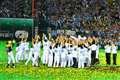初心者ということなので付け加えますと、フラッシュなんぞは(外付けのものを含めて)あれだけ距離があると全く用を成しません。ましてや内蔵フラッシュというものはスナップ写真を撮る程度の距離でしか効果がないもので、使っても選手や他の観客の迷惑になるだけです。