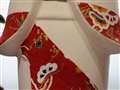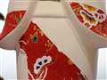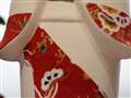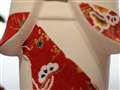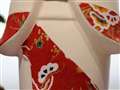 参考写真を拝見した限り、赤い模様は人形さんの目とほぼ同じ距離に見えましたが、錯覚でしたら失礼しました。